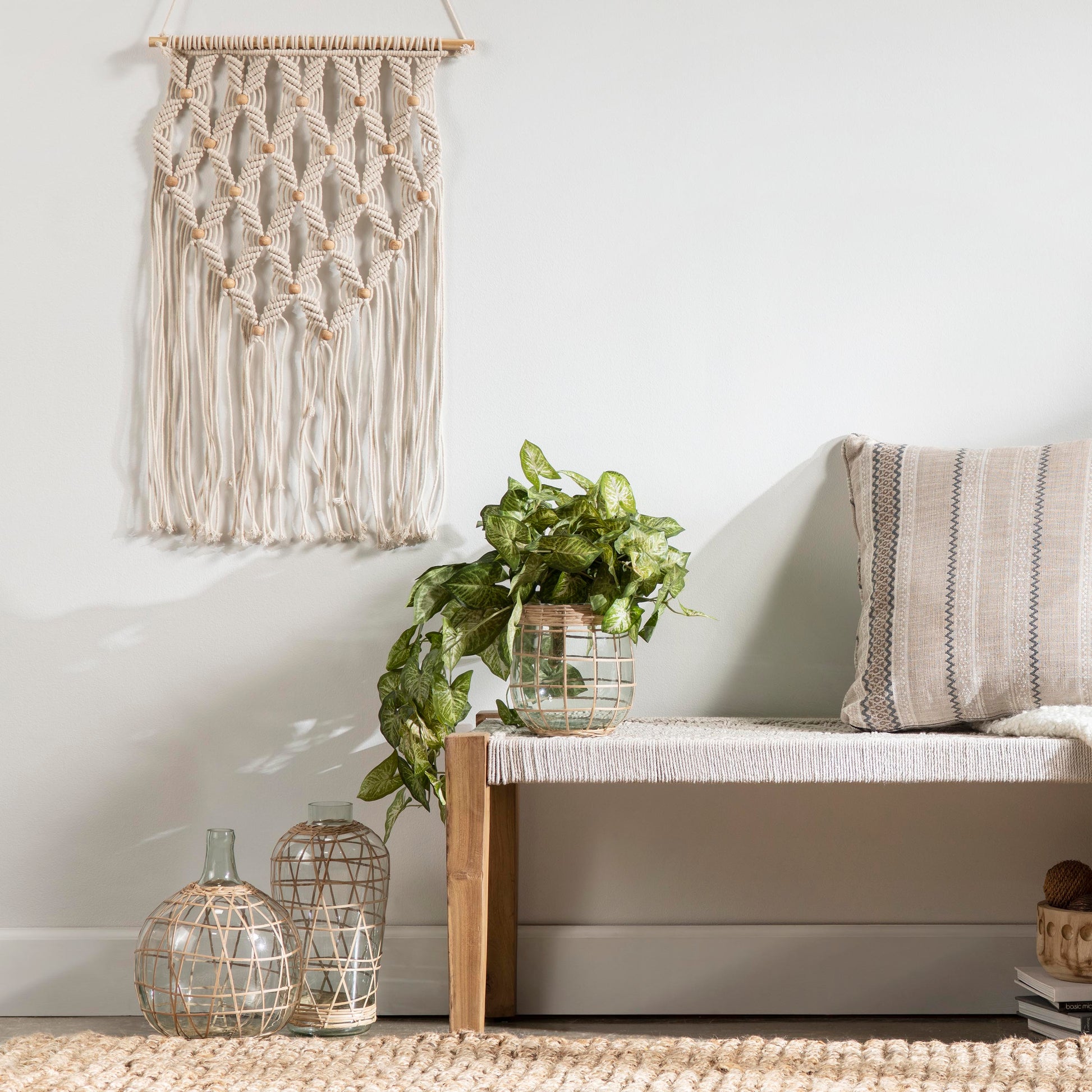 The Crestview Collection Bar Harbor Bottle Green Glass with Cane Wrapping Candleholder with varying shapes and heights. With just a hint of green in the glass, these pieces add color to your decor in a soft tone making the natural tan color of the cane wrapping the highlight of the piece. Set of 3
